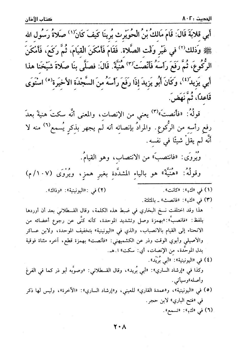أبي قلابة، قال: قام مالك بن الحويرث يرينا كيف كان صلاة رسول الله - صَلَّى اللهُ عَلَيْهِ وَسَلَّمَ -، وذلك في غير وقت الصلاة، فقام فأمكن القيام، ثم ركع فأمكن الركوع، ثم رفع رأسه فأنصت هنية. قال: فصلى بنا صلاة شيخنا هذا: أبي بريد، وكان أبو بريد إذا رفع رأسه من السجدة الأخيرة أستوى قاعداً، ثم نهض.