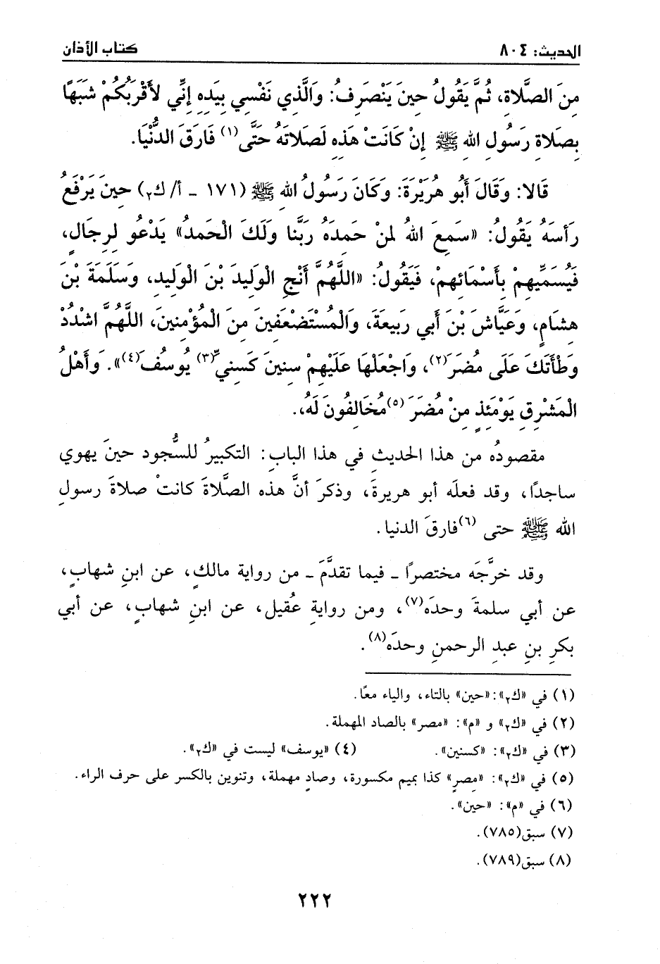 804 - قالا: وقال أبو هريرة، وكان رسول الله - صَلَّى اللهُ عَلَيْهِ وَسَلَّمَ - حين يرفع رأسه يقول: