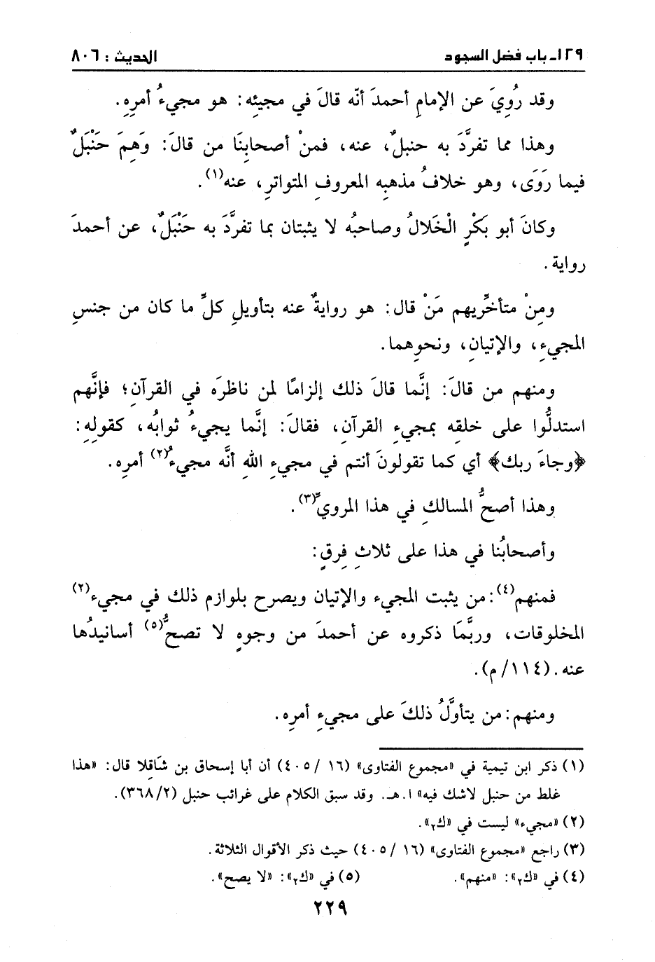 فمنهم من يثبت المجيء والإتيان، ويصرح بلوازم ذلك في المخلوقات، وربما ذكروه عن أحمد من وجوه لا تصح أسانيدها عنه.