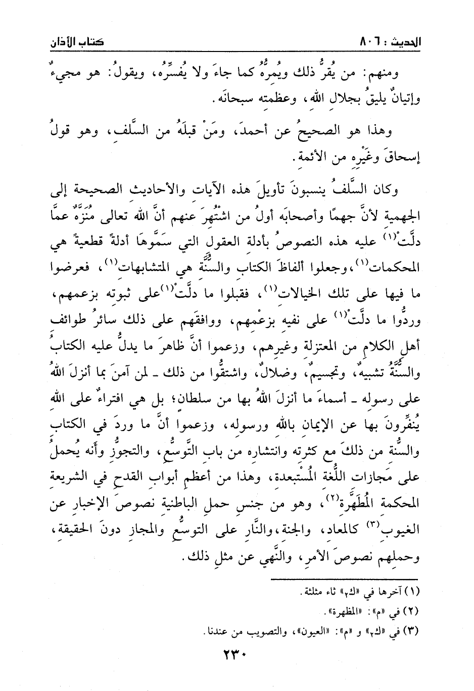 وكان السلف ينسبون تأويل هذه الآيات والأحاديث الصحيحة إلى الجهمية؛ لأن جهماً وأصحابه أول من أشتهر عنهم أن الله تعالى منزه عما دلت عليه هذه النصوص بأدلة العقول التي سموها أدلة قطعية هي المحكمات، وجعلوا ألفاظ الكتاب والسنة هي المتشابهات فعرضوا ما فيها على تلك الخيالات، فقبلوا ما دلت على ثبوته بزعمهم، وردوا مادلت على نفيه بزعمهم، ووافقهم على ذلك سائر طوائف أهل الكلام من المعتزلة وغيرهم.