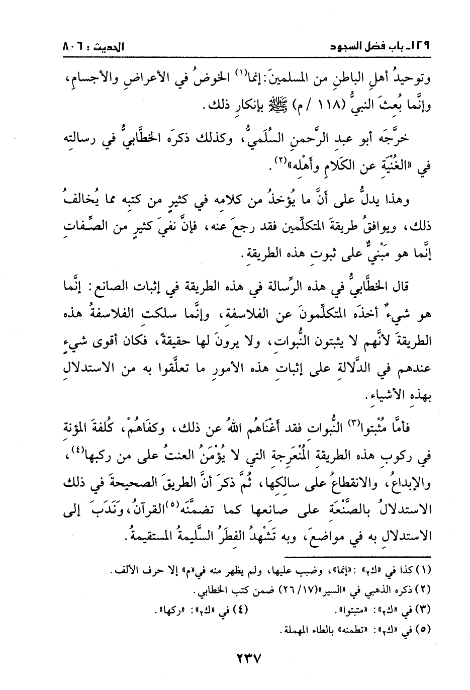 قال الخطابي في هذه الرسالة في هذه الطريقة في إثبات الصانع: إنما هو شيء أخذه المتكلمون عن الفلاسفة، وإنما سلكت الفلاسفة هذه الطريقة لأنهم لا يثبتون النبوات ولا يرون لها حقيقة، فكان أقوى شيء عندهم في الدلالة على إثبات هذه الأمور ما تعلقوا به من الاستدلال بهذه الأشياء، فأما مثبتوا النبوات، فقد أغناهم الله عن ذلك، وكفاهم كلفة المؤنة في ركوب هذه الطريقة المتعرجة التي لا يؤمن العنت على من ركبها، والإبداع والانقطاع على سالكها.