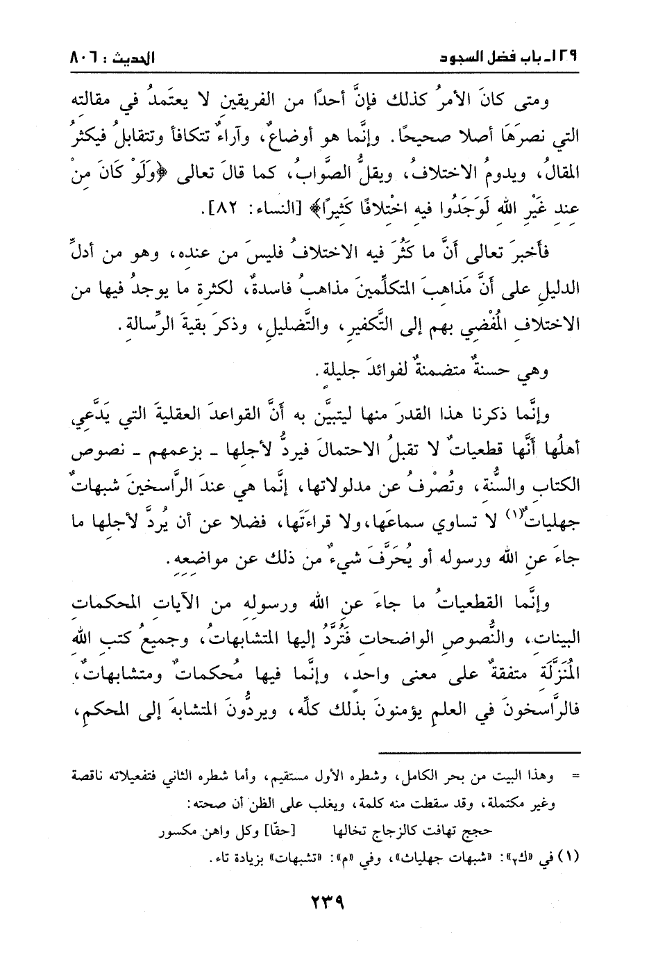 وذكر بقية الرسالة، وهي حسنة متضمنة لفوائد جليلة، وإنما ذكرنا هذا القدر منها ليتبين به أن القواعد العقلية التي يدعي أهلها أنها قطعيات لا تقبل الاحتمال، فترد لأجلها –بزعمهم –نصوص الكتاب والسنة، وتصرف عن مدلولاتها، إنما هي عند الراسخين شبهات جهليات، لا تساوي سماعها، ولا قراءتها، فضلا عن أن يرد لأجلها ما جاء عن الله ورسوله، أو يحرف شيء من ذلك عن مواضعه.
