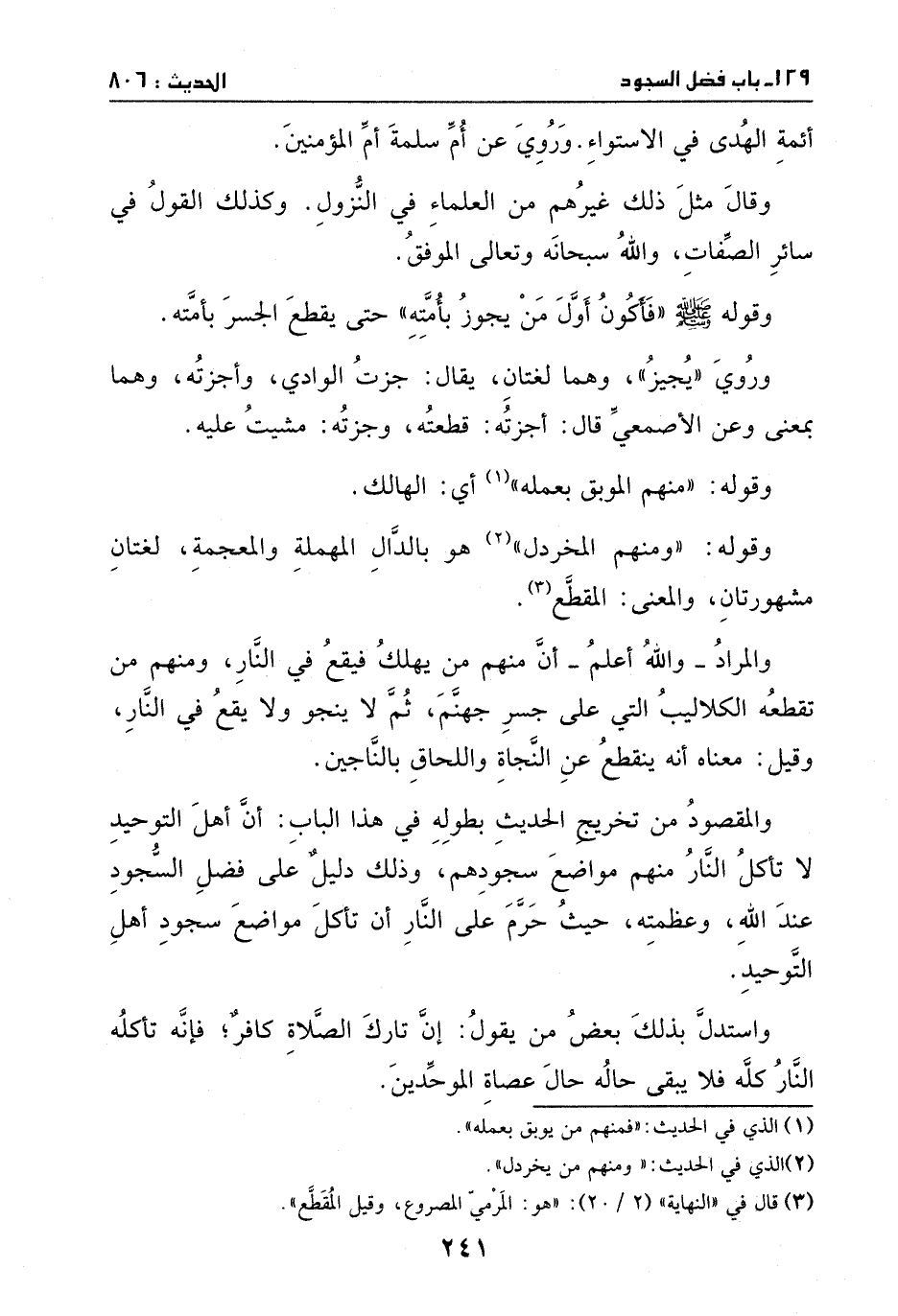 والمقصود من تخريج الحديث بطوله في هذا الباب: أن أهل التوحيد لا تأكل النار منهم مواضع سجودهم، وذلك دليل على فضل السجود عند الله وعظمته، حيث حرّم على النار أن تأكل مواضع سجود أهل التوحيد.