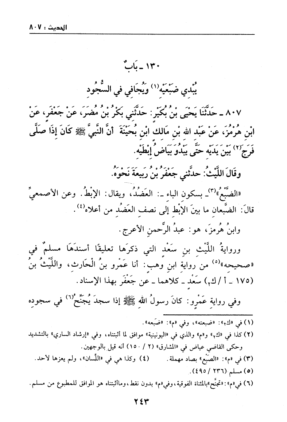 807 - ثنا يحيى بن بكير: حدثني بكر بن مضر، عن جعفر، عن ابن هرمز، عن عبد الله بن مالك بن بحينة، أن النبي - صَلَّى اللهُ عَلَيْهِ وَسَلَّمَ - كان إذا صلى فرج بين يديه حتى يبدو بياض إبطيه.