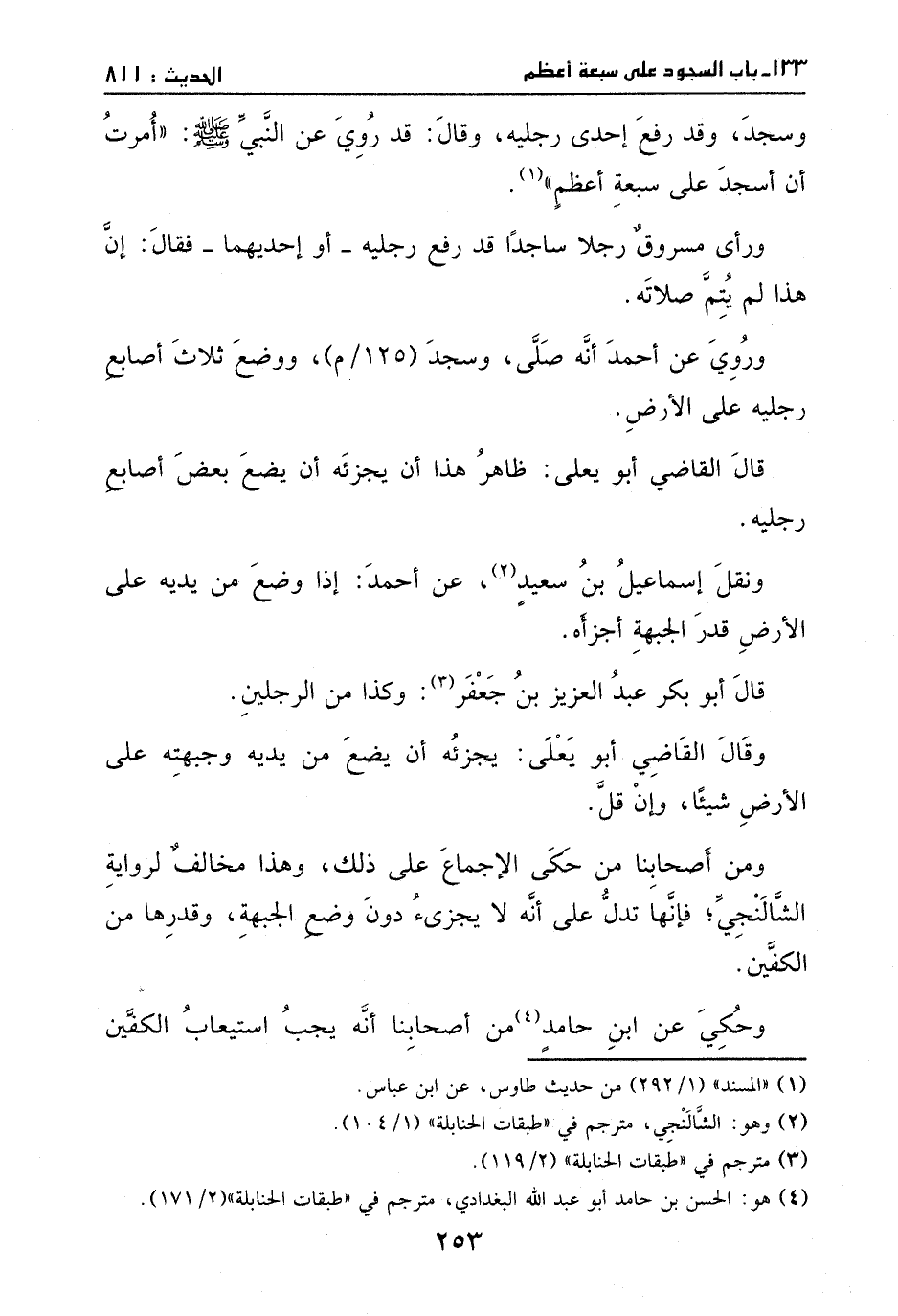 وروي عن أحمد، أنه صلى وسجد ووضع ثلاث أصابع رجليه على الأرض.