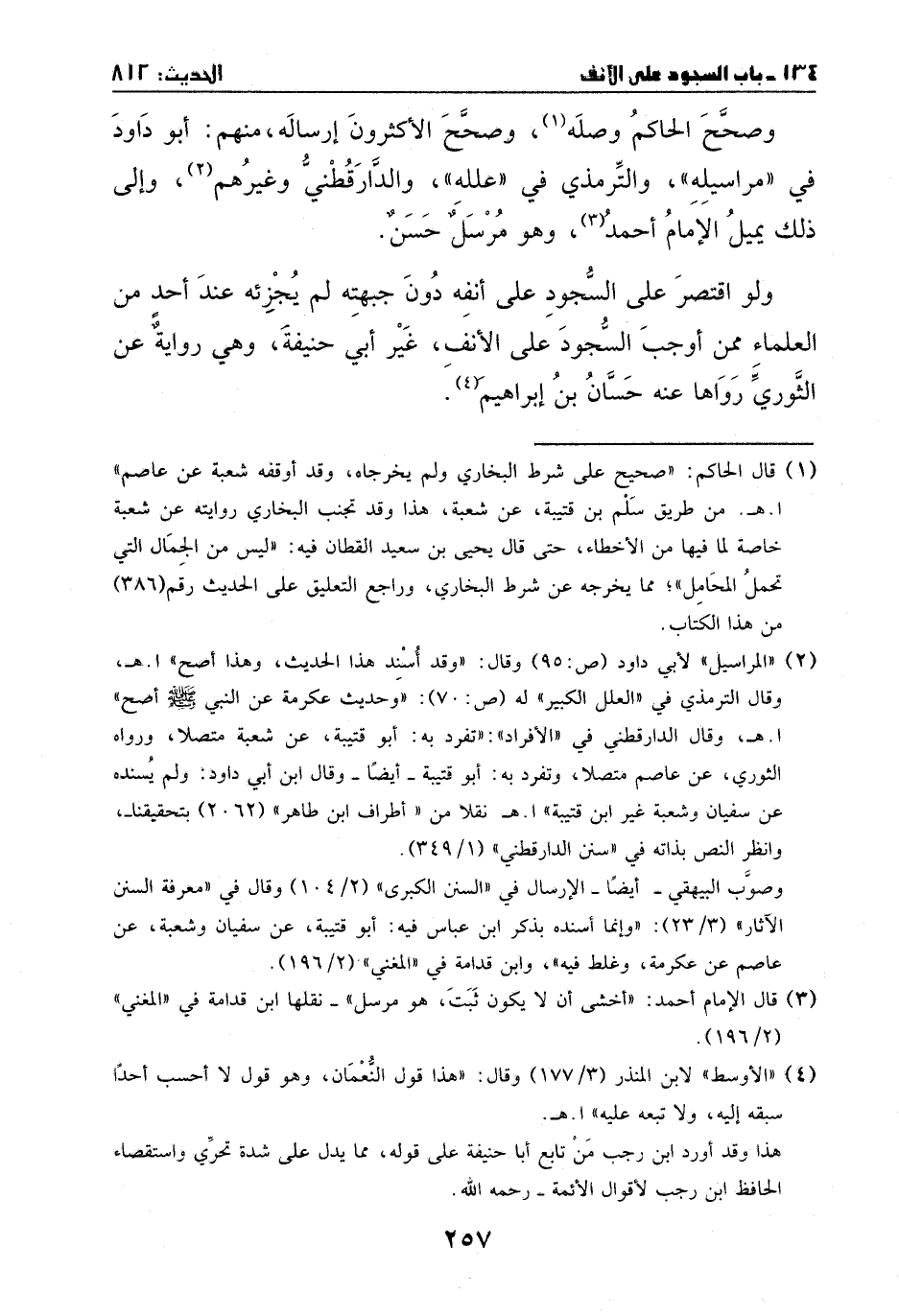 ولو اقتصر على السجود على أنفه دون جبهته، لم يجزئه عند أحد من العلماء ممن أوجب السجود على الأنف، غير أبي حنيفة، وهي رواية عن الثوري، رواها عنه