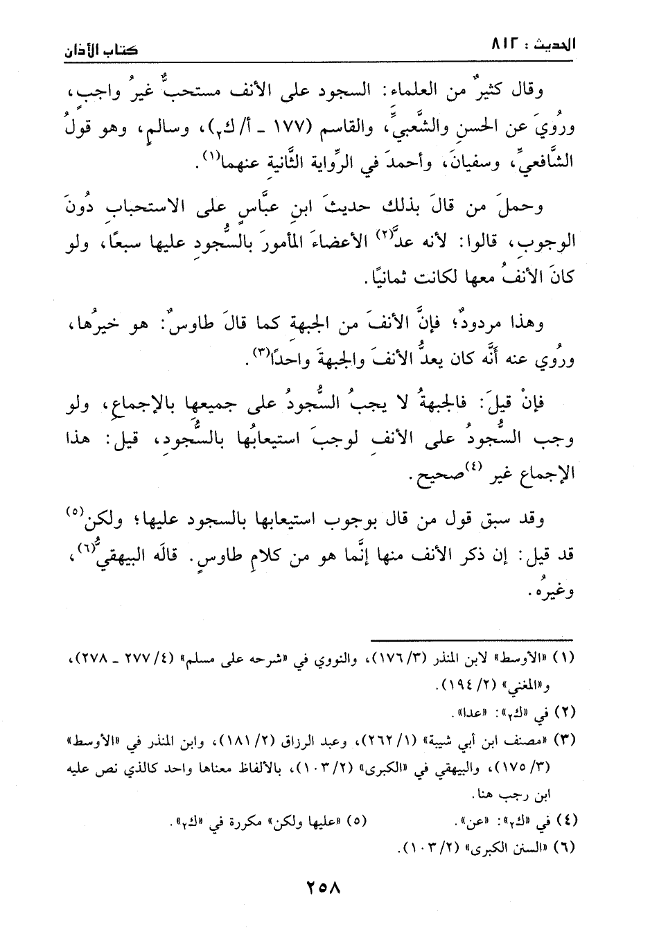 وقال كثير من العلماء: السجود على الأنف مستحب غير واجب، وروي عن الحسن والشعبي والقاسم وسالم، وهو قول الشافعي وسفيان وأحمد –في الرواية الثانية عنهما.