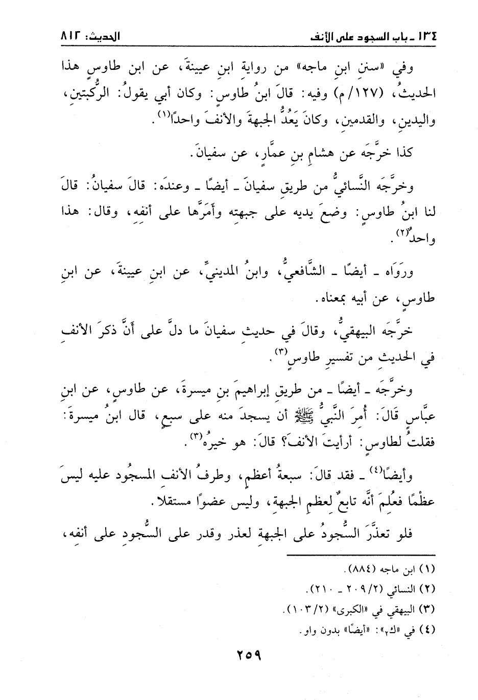 وفي ((سنن ابن ماجه)) من رواية ابن عيينة، عن ابن طاوس هذا الحديث، وفيه: قال ابن طاوس: وكان أبي يقول: الركبتين واليدين والقدمين، وكان يعد الجبهة وإلانف واحداً.