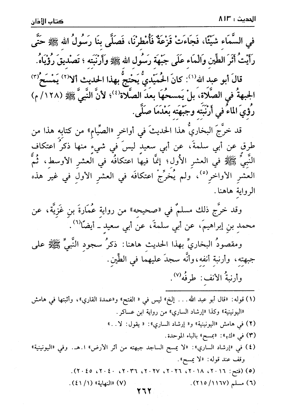 قال أبو عبد الله: كان الحميدي يحتج بهذا الحديث، إلا يمسح الجبهة في الصلاة، بل يمسحها بعد الصلاة، لأن النبي - صَلَّى اللهُ عَلَيْهِ وَسَلَّمَ - رُئي الماء في أرنبته وجبهته بعد ما صلى.