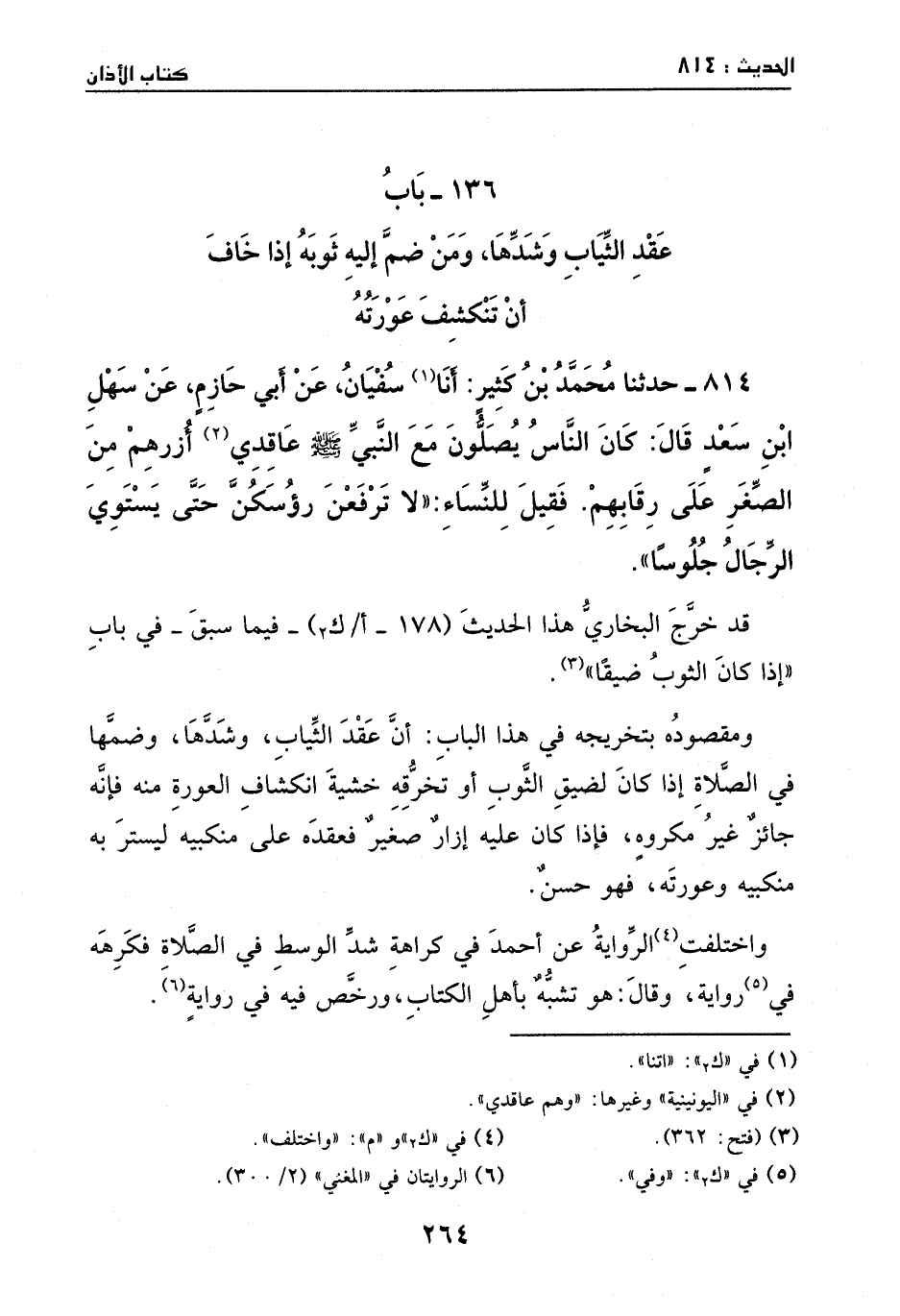 814 - حدثنا محمد بن كثير: أنا سفيان، عن أبي حازم، عن سهل بن سعد، قال: كان الناس يصلون مع النبي - صَلَّى اللهُ عَلَيْهِ وَسَلَّمَ - عاقدي أزرهم من الصغر على رقابهم، فقيل للنساء: لا ترفعن رؤوسكن حتى يستوي الرجال جلوساً.