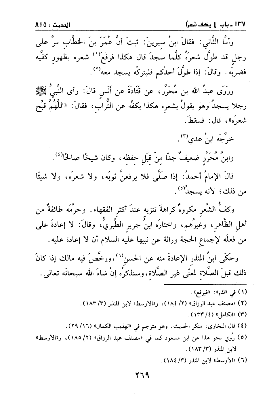 فقال ابن سيرين: نبئت أن عمر بن الخطاب مر على رجل قد طوّل شعره، كلما سجد قال هكذا، فرفع شعره بظهور كفيه، فضربه، وقال: إذا طول أحدكم فليتركه يسجد معه.