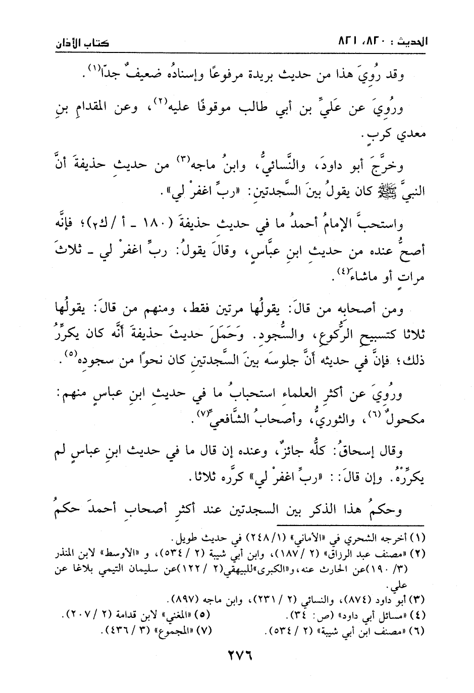 وخرج أبو داود والنسائي وابن ماجه من حديث حذيفة، أن النبي - صَلَّى اللهُ عَلَيْهِ وَسَلَّمَ - كان يقول بين السجدتين: ((رب اغفر لي)) .