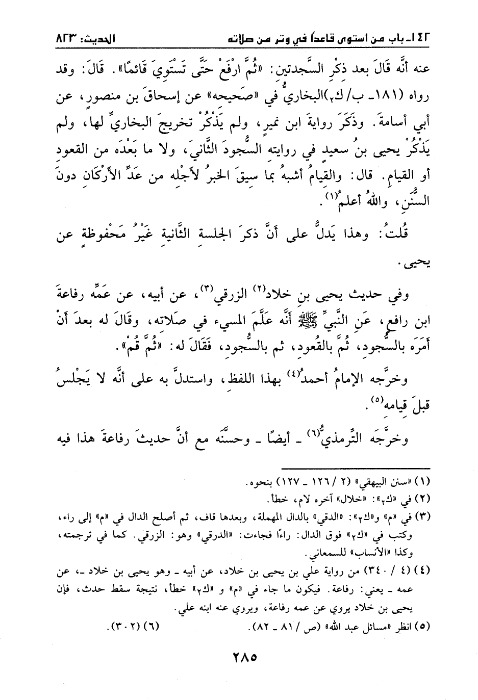 وفي حديث يحيى بن خلاد الزرقي، عن أبيه، عن عمه رفاعة بن رافع، عن النبي - صَلَّى اللهُ عَلَيْهِ وَسَلَّمَ -، أنه علم المسيء في صلاته، وقال له بعد أن أمره بالسجود، ثم بالقعود، ثم بالسجود، فقال له: ((ثم قم)) .