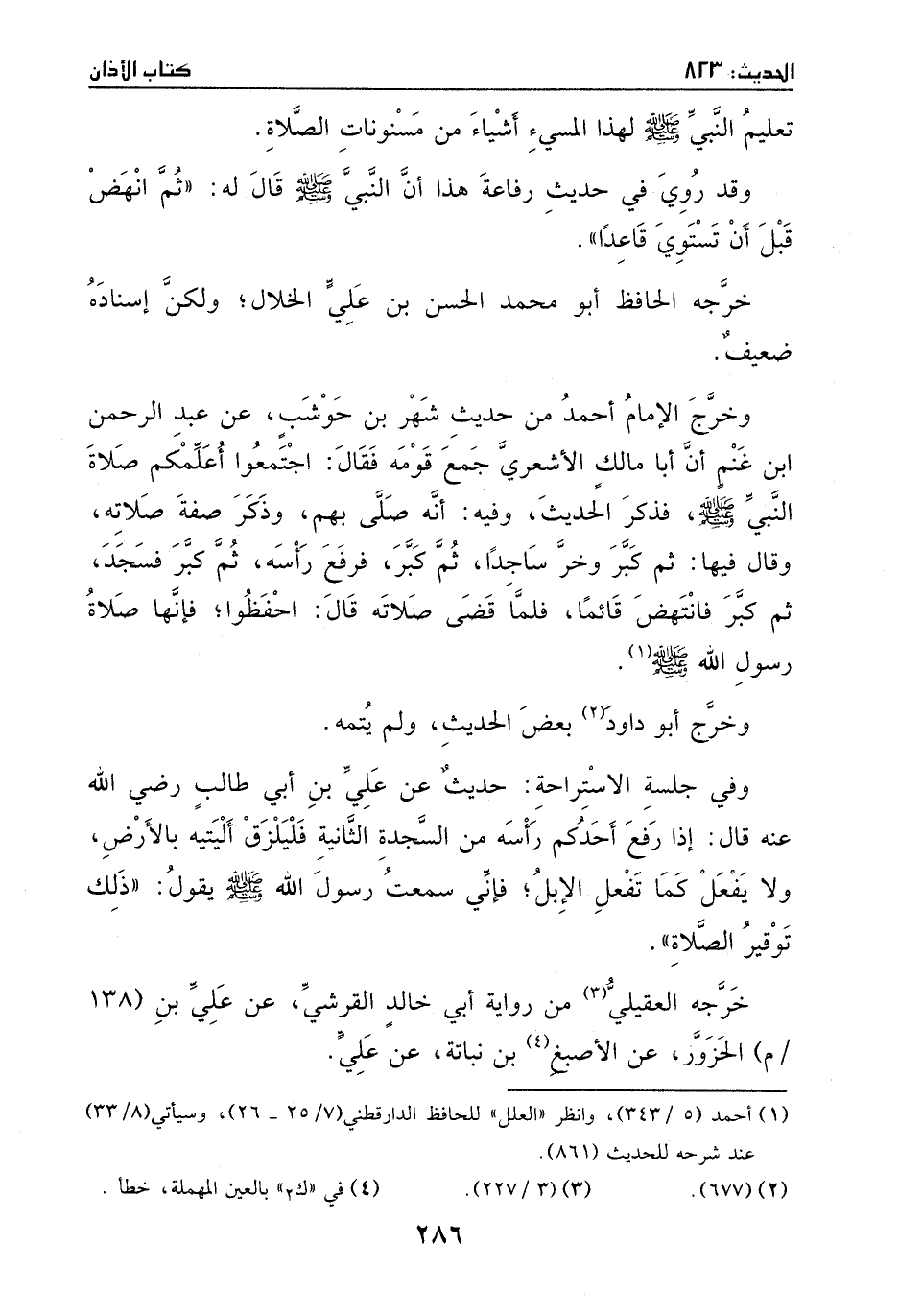 وفي جلسة الاستراحة: حديث عن علي بن أبي طالب – رضي الله عنه -، قال: إذا رفع أحدكم رأسه من السجد الثانية فليلزق اليتيه بالارض، ولا يفعل كما تفعل الإبل؛ فإني سمعت رسول الله - صَلَّى اللهُ عَلَيْهِ وَسَلَّمَ - يقول: ((ذَلِكَ توقير الصَّلاة)) .