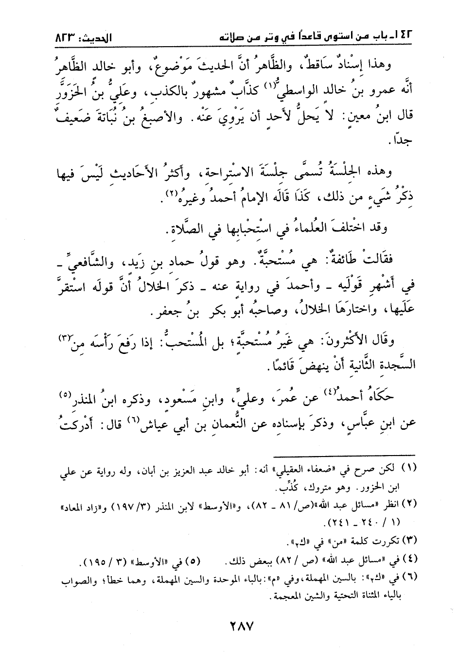 وهذه الجلسة تسمى جلسة الاستراحة، وأكثر الأحاديث ليس فيها ذكر شيء من ذلك، كذا قاله الإمام أحمد وغيره.