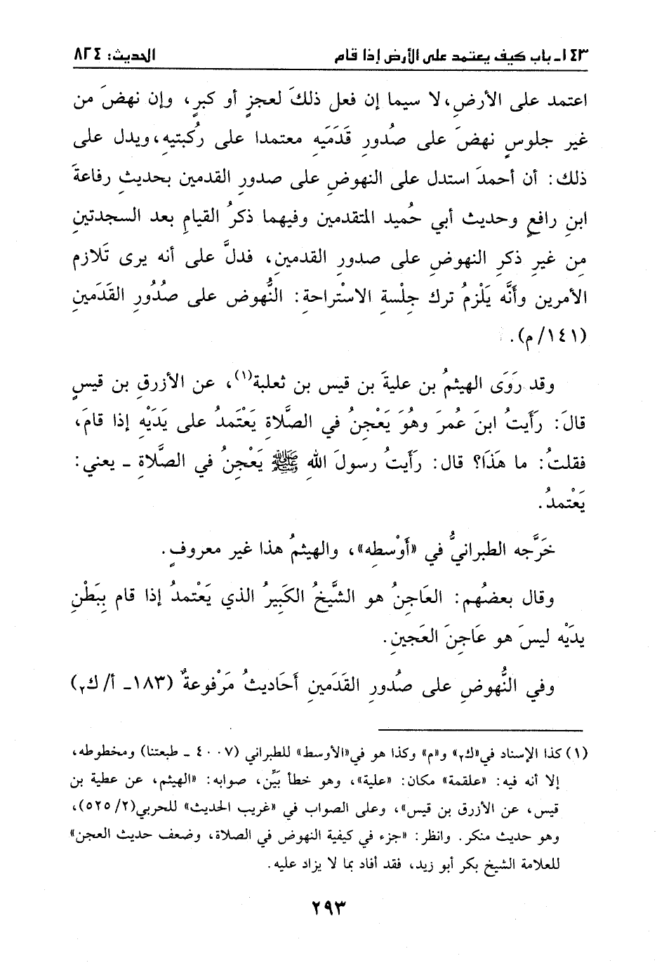 اعتمد على الأرض، لا سيما إن فعل ذلك لعجز أو كبر، وإن نهض من غير جلوس نهض على صدور قدميه، معتمداً على ركبتيه.