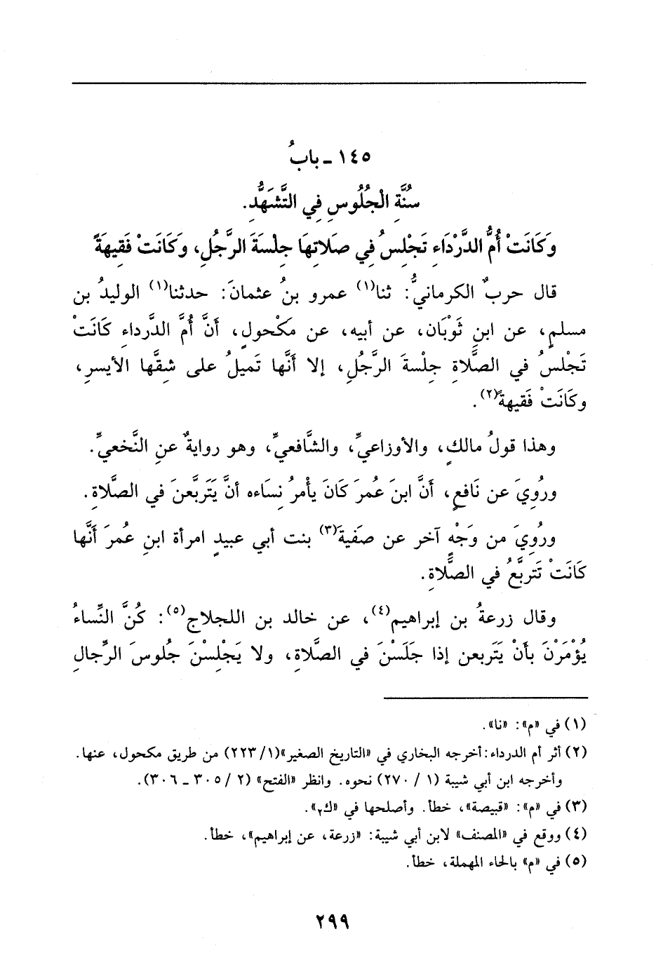 وكانت أم الدرداء تجلس في صلاتها جلسة الرجل، وكانت فقيهة قال حرب الكرماني: نا عمرو بن عثمان: نا الوليد بن مسلم، عن ابن ثوبان، عن أبيه، عن مكحول، أن أم الدرداء كانت تجلس في الصلاة جلسة الرجل إلا إنها تميل على شقها الأيسر، وكانت فقيهةً.