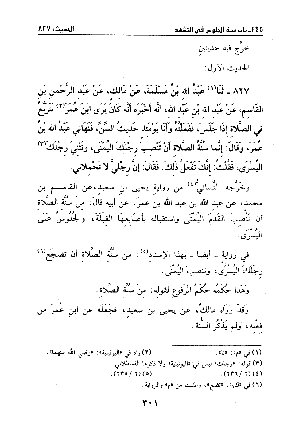 عبد الله بن عمر عن أبيه قال: من سنة الصلاة أن تنصب القدم اليمنى واستقباله بأصابعها القبلة، والجلوس على اليسرى وفي رواية – أيضاً - بهذا إسناد: من سنة الصلاة أن تضجع رجلك اليسرى وتنصب اليمنى.