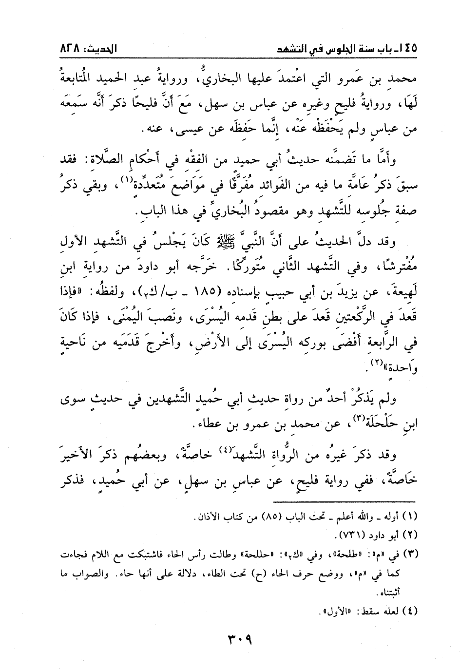 ولم يذكر أحد من رواة حديث أبي حميد التشهدين في حديثه سوى ابن حلحلة عن محمد بن عمرو بن عطاء وقد ذكر غيره من الرواة التشهد الأول خاصة وبعضهم ذكر الأخير خاصة.