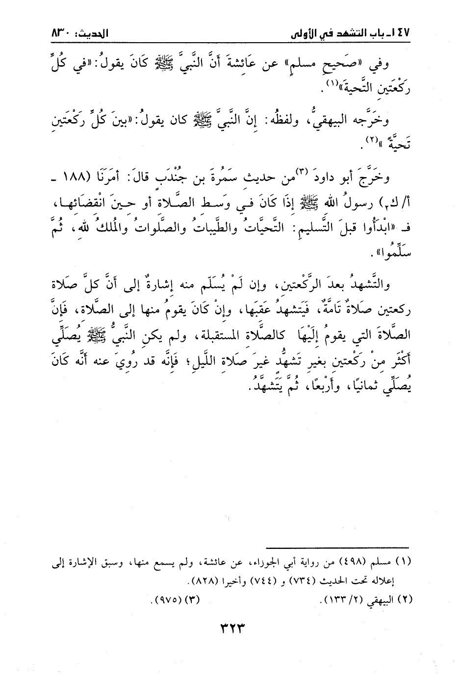 ولم يكن النبي - صَلَّى اللهُ عَلَيْهِ وَسَلَّمَ - يصلي أكثر من ركعتين بغير تشهد غير صلاة الليل؛ فإنه قد روي عنه أنه كان يصلي ثمانياً واربعاً ثم يتشهد.