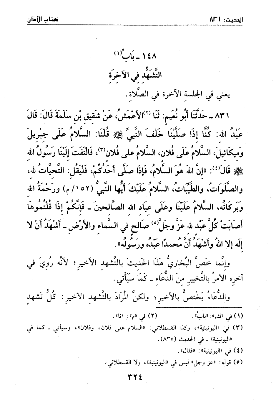 831 - حدثنا أبو نعيم: ثنا الأعمش، عن شقيق بن سلمة، قال: قال عبد الله: كنا إذا صلينا خلف النبي - صَلَّى اللهُ عَلَيْهِ وَسَلَّمَ - قلنا: السلام على جبريل ومكائيل، السلام على فلان السلام على فلان، فالتفت إلينا رسول الله - صَلَّى اللهُ عَلَيْهِ وَسَلَّمَ -، قال: ((إن الله هو السلام)) فإذا صلى أحدكم فليقل: التحيات لله والصلوات والطيبات، السلام عليك أيها النبي ورحمة الله وبركاته، السلام علينا وعلى عباد الله الصالحين فإنكم إذا قلتموها أصابت كل عبد لله عز وجل صالح في السماء وإلا رض، أشهد أن لا إله إلا الله وأشهد أن محمداً عبده ورسوله)) .