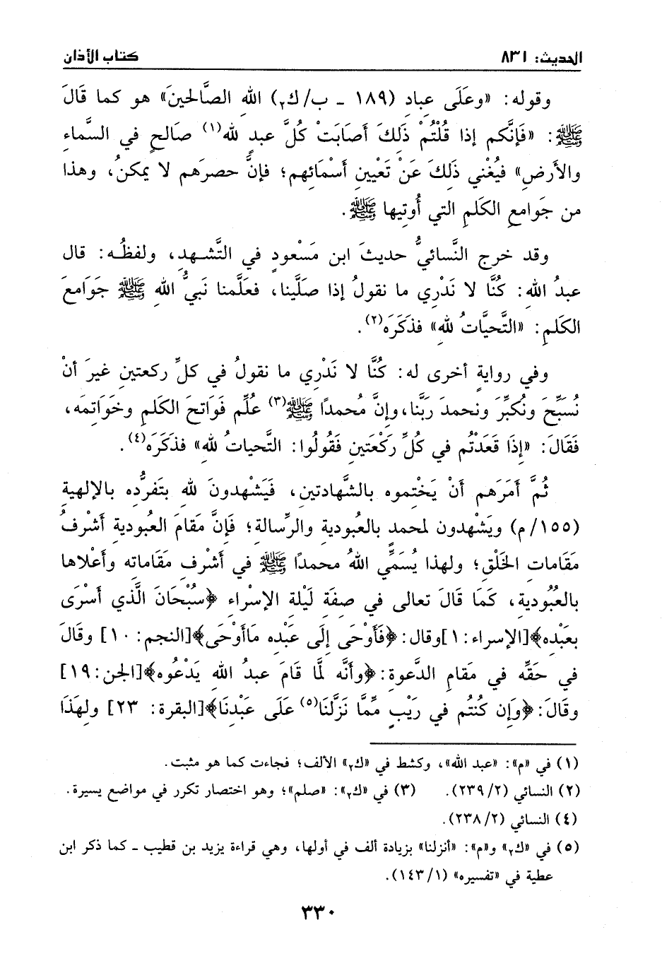 وقوله: ((وعلى عباد الله الصالحين)) هو كما قال - صَلَّى اللهُ عَلَيْهِ وَسَلَّمَ -: ((فإنكم إذا قلتم ذلك أصابت كل عبد لله صالح في السماء والأرض)) . فيعني ذلك عن تعيين أسمائهم؛ فإن حصرهم لا يمكن، وهذا من جوامع الكلم التي أوتيها - صَلَّى اللهُ عَلَيْهِ وَسَلَّمَ - وقد خرّج النسائي حديث ابن مسعود في التشهد، ولفظه: قال عبد الله: كنا لا ندري ما نقول إذا صلينا، فعلمنا نبي الله - صَلَّى اللهُ عَلَيْهِ وَسَلَّمَ - جوامع الكلم: ((التحيات لله)) – فذكره. وفي رواية أخرى له: كنا لا ندري ما نقول في كل ركعتين، غير أن نسبح ونكبر ونحمد ربنا، وأن محمد - صَلَّى اللهُ عَلَيْهِ وَسَلَّمَ - علم فواتح الكلم وخواتمه، فقال: ((إذا قعدتم في كل ركعتين فقولوا: التحيات الله)) - فذكره.