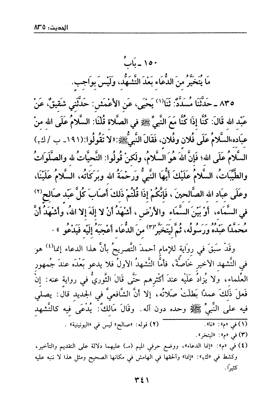 835 - حدثنا مسدد: ثنا يحيى، عن الأعمش: حدثني شقيق، عن عبد الله، قال: كُنا إذا كُنا مع النبي - صَلَّى اللهُ عَلَيْهِ وَسَلَّمَ - في الصلاة قلنا: السلام على الله من عباده، السلام على فلان وفلان، فقال النبي - صَلَّى اللهُ عَلَيْهِ وَسَلَّمَ -: ((لا تقولوا السلام على الله فإن الله هو السلام، ولكن قولوا: التحيات لله والصلوات والطيبات، السلام عليك أيها النبي ورحمة الله وبركاته، السلام علينا وعلى عباد الله الصالحين؛ فإنكم إذا قلتم ذلك أصاب كل عبد صالح في السماء – أو بين السماء والأرض – أشهد إلا إله إلا الله، وأشهد أن محمداً عبده ورسولهُ، ثم ليتخير من الدعاء أعجبه إليه فبدعوا)) .