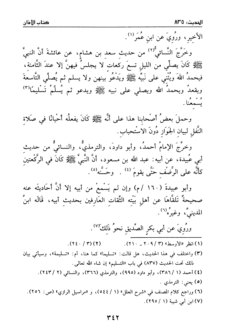 وخرّج الإمام أحمد وأبو داود والترمذي والنسائي من حديث أبي عبيدة، عن أبيه عبد الله بن مسعود، أن النبي - صَلَّى اللهُ عَلَيْهِ وَسَلَّمَ - كان في الركعتين كأنه على الرضف حتى يقوم.