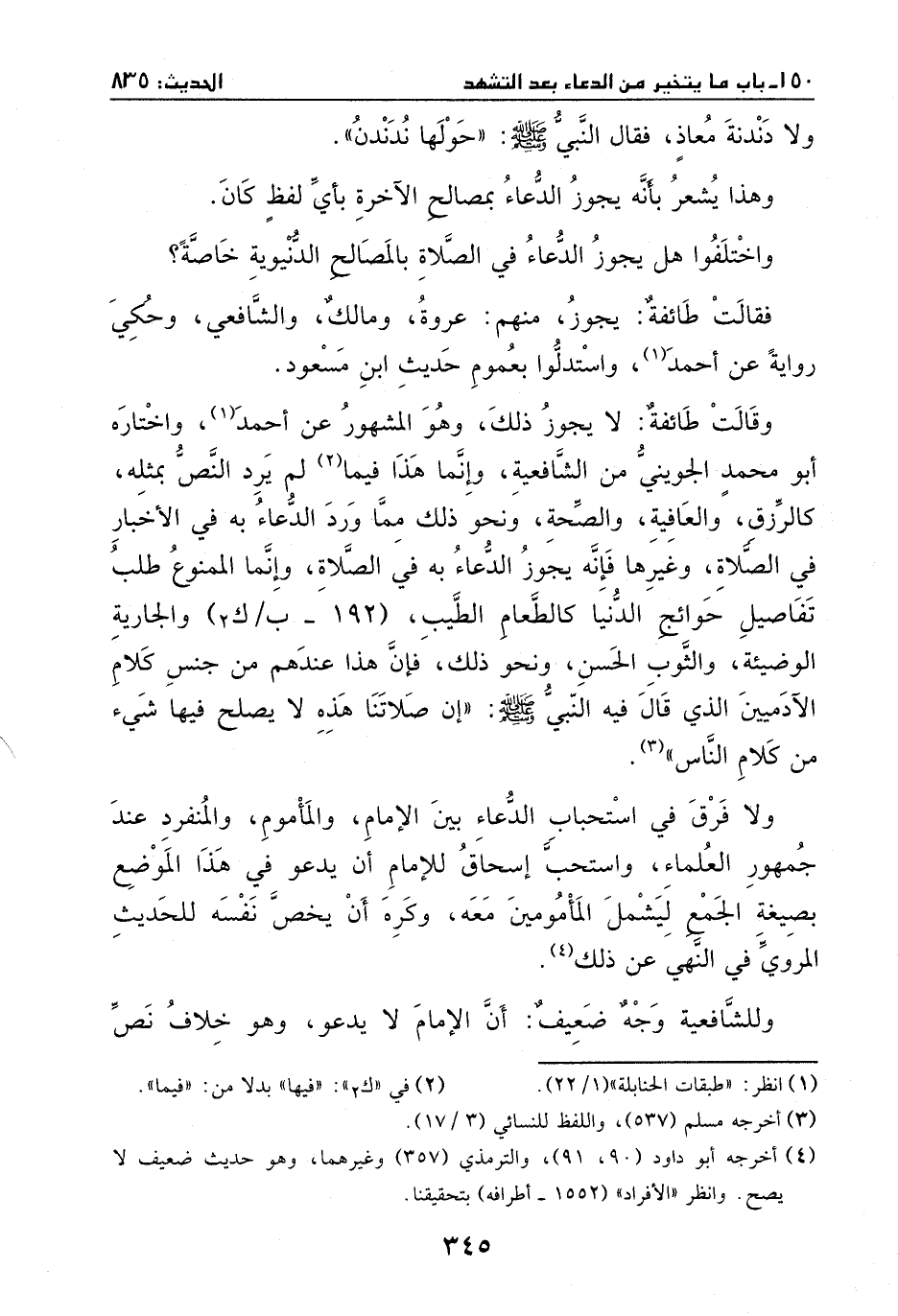 وقالت طائفة: لا يجوز ذلك، وهو المشهور عن أحمد، واختاره أبو محمد الجويني من الشافعية. وإنما هذا فيما لم يرد النص بمثله كالرزق والعافية والصحة ونحو ذلك مما ورد الدعاء به في الأخبار في الصلاة وغيرها، فإنه يجوز الدعاء به في الصلاة، وإنما الممنوع طلبُ تفاصيل حوائج الدنيا؛ كالطعام الطيب والجارية الوضيئة.