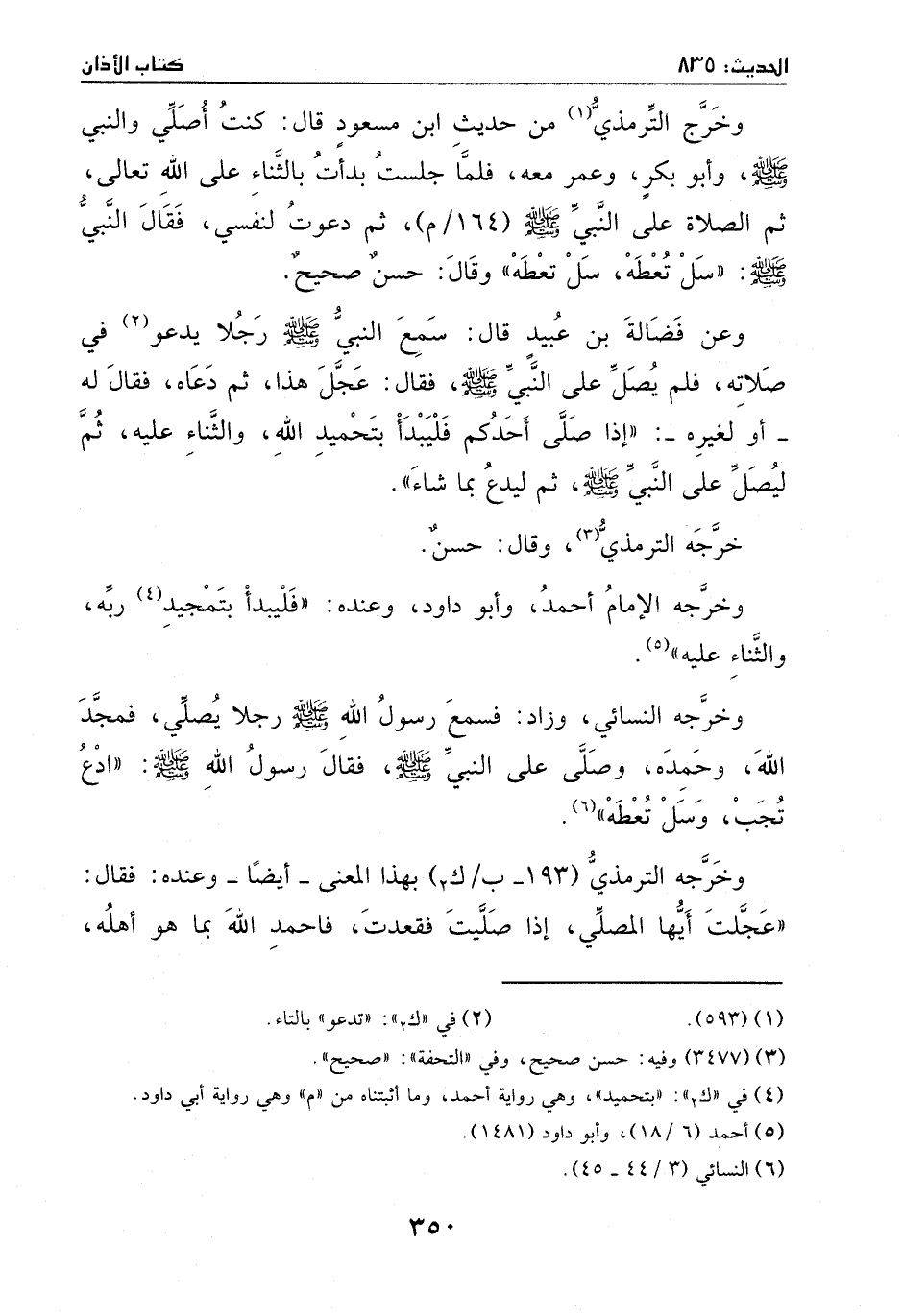 وعن فضالة بن عبيدٍ، قال: سمع النبي - صَلَّى اللهُ عَلَيْهِ وَسَلَّمَ - رجلاً يدعو في صلاته، فلم يصل على النبي - صَلَّى اللهُ عَلَيْهِ وَسَلَّمَ -، فقال: ((عجل هذا)) ، ثم دعاه، فقال له –أو لغيره -: ((إذا صلى أحدكم فليبدأ بتحميد الله والثناء عليه، ثم ليصل على النبي - صَلَّى اللهُ عَلَيْهِ وَسَلَّمَ -، ثم ليدع بما شاء)) .