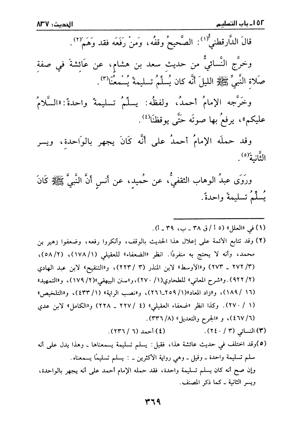 وروي عبد الوهاب الثقفي، عن حميدٍ، عن أنسٍ، أن النبي - صَلَّى اللهُ عَلَيْهِ وَسَلَّمَ - كان يسلم تسليمة واحدة.