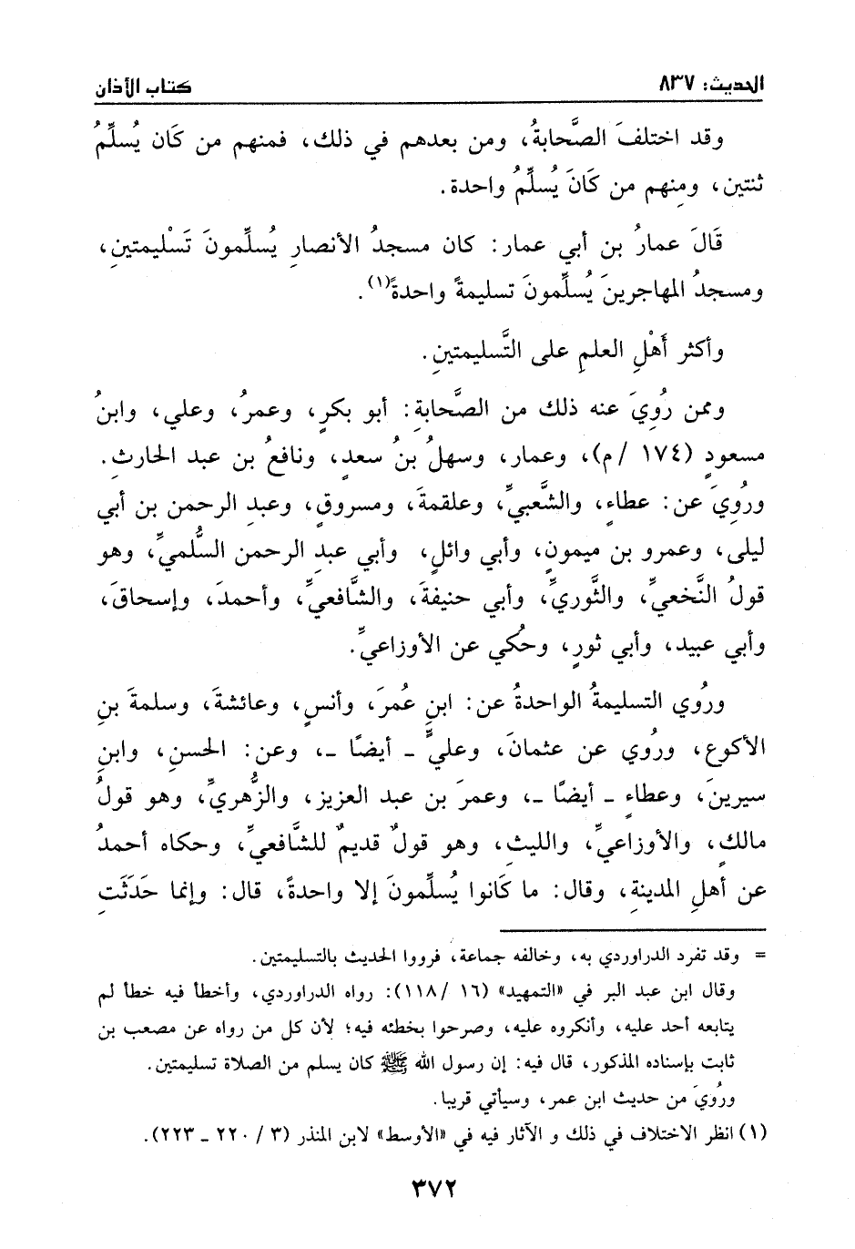 قال عمار بن أبي عمارٍ: كان مسجد الأنصار يسلمون تسليمتين، ومسجد المهاجرين يسلمون تسليمةً واحدةً.