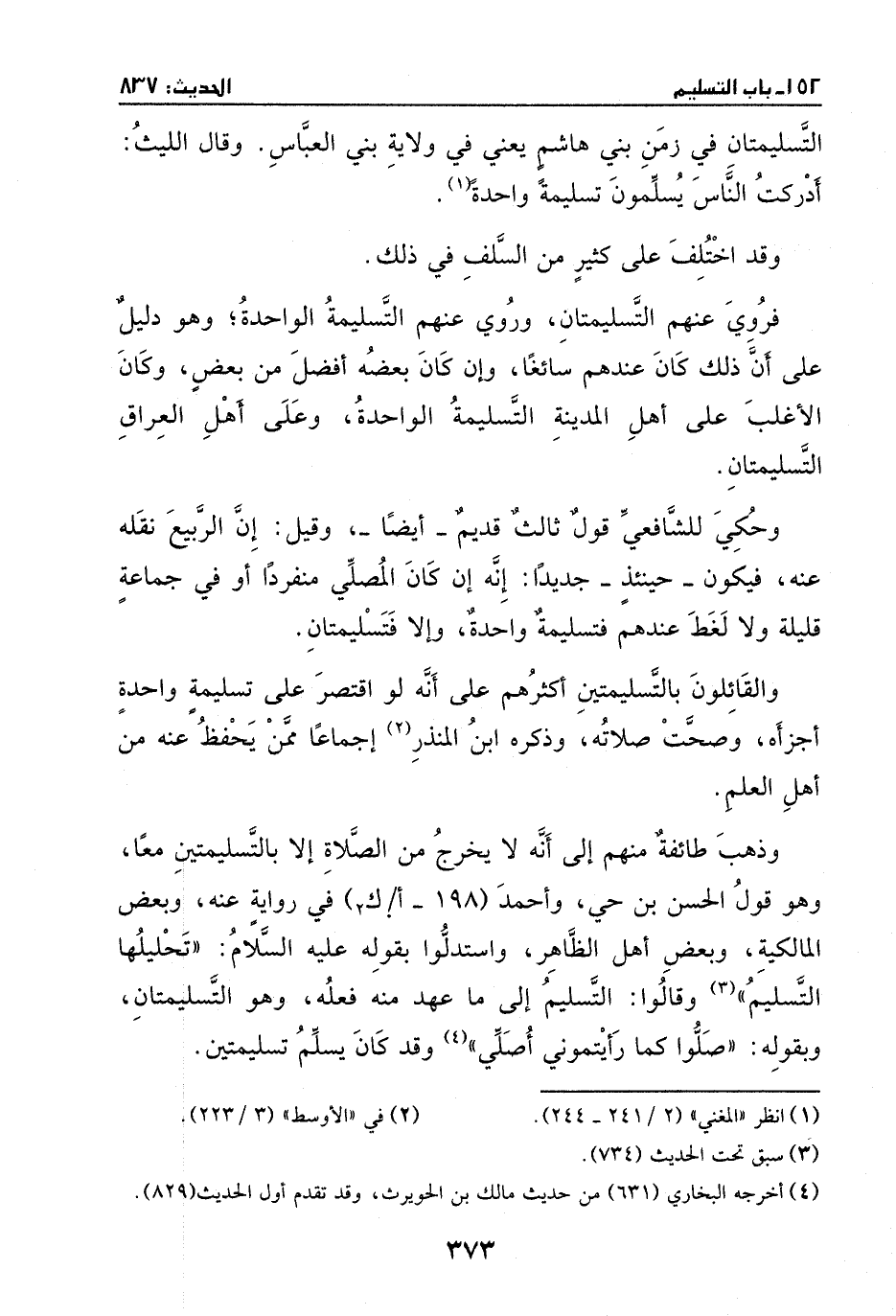 وذهب طائفة منهم إلى أنه لا يخرج من الصلاة إلا بالتسليمتين معاً، وهو قول الحسن بن حي وأحمد –في روايةٍ عنه – وبعض المالكية وبعض أهل الظاهر.
