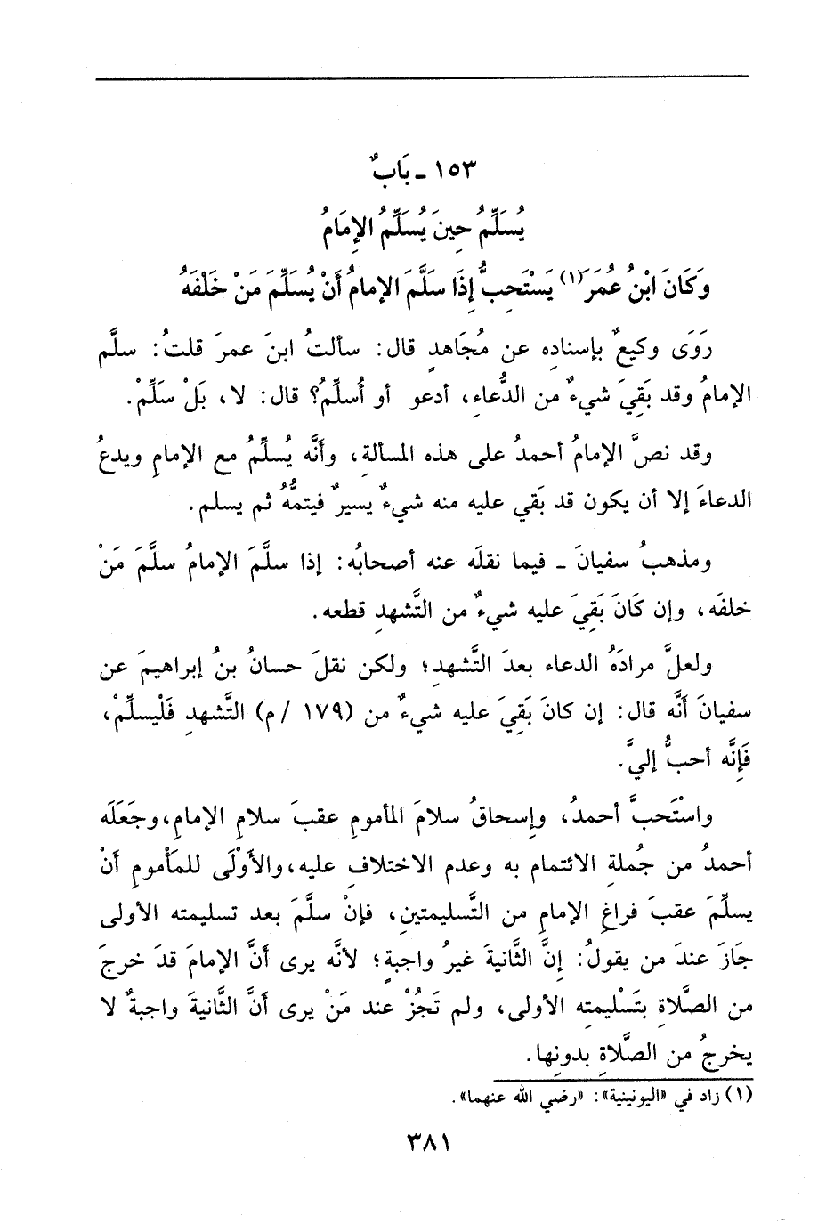 وكان ابن عمر يستحب إذا سلم الإمام أن يسلم من خلفه.