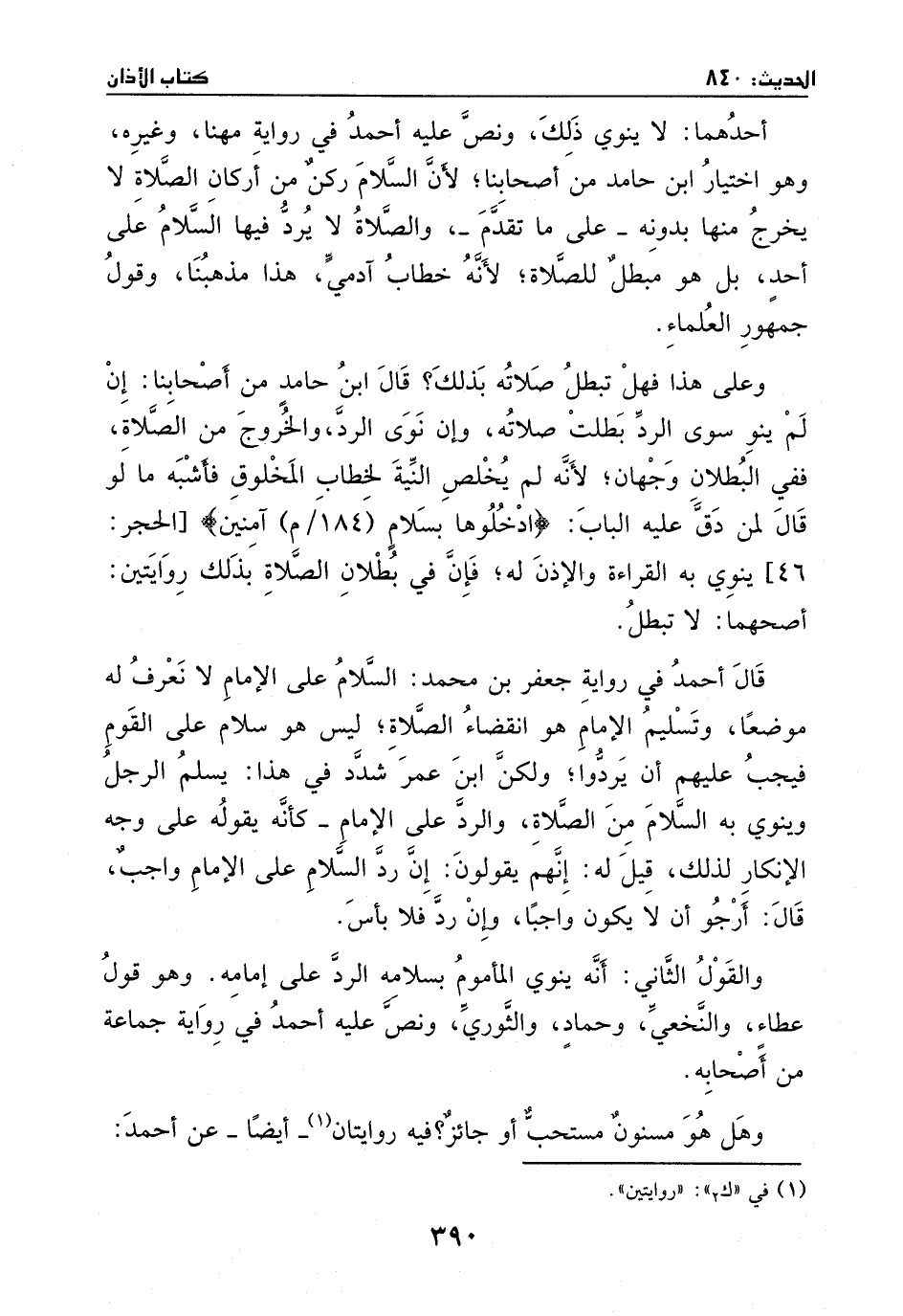 قالَ أحمد – في رواية جعفر بن محمدٍ -: السلام على الإمام لا نعرف لهُ موضعاً، وتسليم الإمام هوَ انقضاء الصَّلاة، ليس هوَ سلام على القوم، فيجب عليهم أن يردوا، ولكن ابن عمر شدد في هذا، يسلم الرجل وينوي به السلام من الصَّلاة والرد على