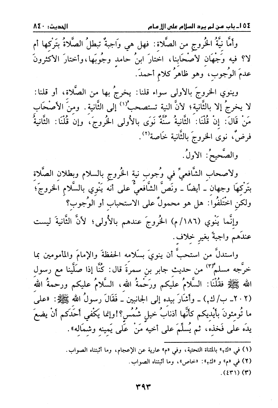 وأما نية الخروج من الصلاة، فهل هي واجبةٌ، تبطل الصلاة بتركها، أم لا؟ فيه وجهان لأصحابنا، اختار ابن حامد وجوبها، واختار الأكثرون عدم الوجوب، وهو ظاهر كلام أحمد.