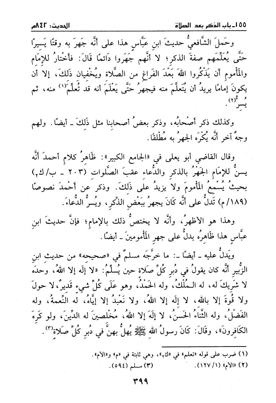 وحمل الشافعي حديث ابن عباسٍ هذا على أنه جهر به وقتاً يسيراً حتى يعلمهم صفة الذكر؛ لا أنهم جهروا دائماً. قال: فأختار للإمام والمأموم أن يذكروا الله بعد الفراغ من الصلاة، ويخفيان ذلك، إلا أن يكون إماما يريد أن يتعلم منه، فيجهر حتى يعلم، أنه قد تعلم منه، ثم يسر.