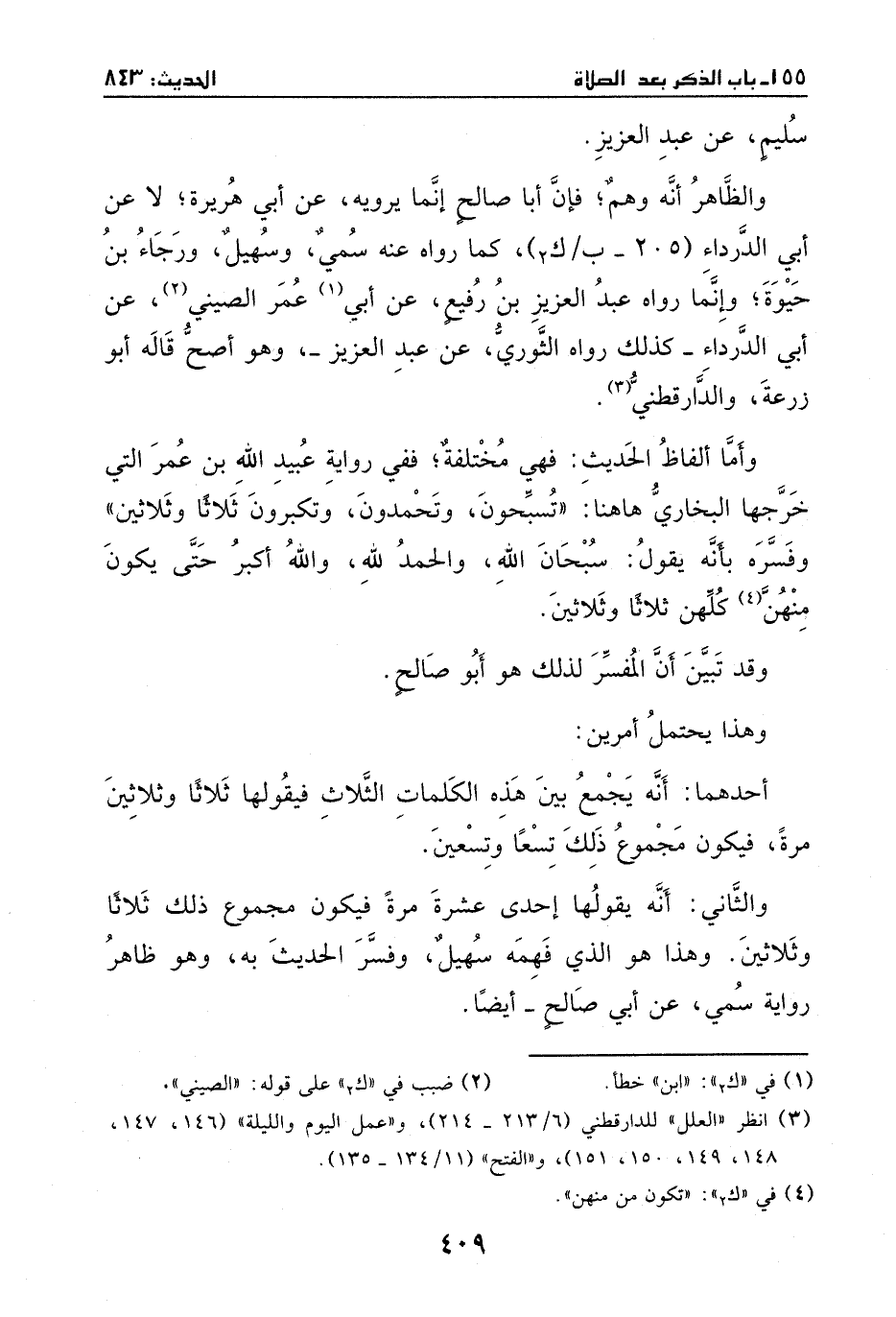 ففي رواية عبيد الله بن عمر التي خرجها البخاري هاهنا: ((تسبحون وتحمدون وتكبرون ثلاثاً وثلاثين)) ، وفسره بأنه يقول: ((سبحان الله، والحمد لله، والله أكبر)) حتى يكون منهن كلهن ثلاثاً وثلاثين.