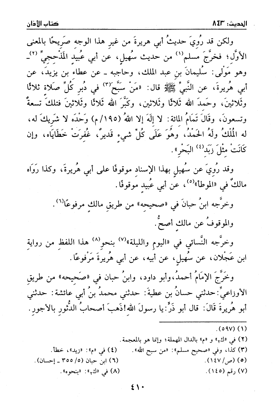 فخرج مسلمٌ من حديث سهيل، عن أبي عبيد المذحجي –وهو: مولى سليمان بن عبد الملك وحاجبه -، وعن عطاء بن يزيد، عن أبي هريرة، عن النبي - صَلَّى اللهُ عَلَيْهِ وَسَلَّمَ -، قال: ((من سبح في دبر كل صلاة ثلاثاً وثلاثين، وحمد الله ثلاثاً وثلاثين، وكبر الله ثلاثاً وثلاثين، فتلك تسعة وتسعون، وقال تمام المائة: لا إله إلا الله وحده لا شريك له، له الملك، وله الحمد، وهو على كل شيء قدير، غفرت خطاياه، وإن كانت مثل زبد البحر)) .