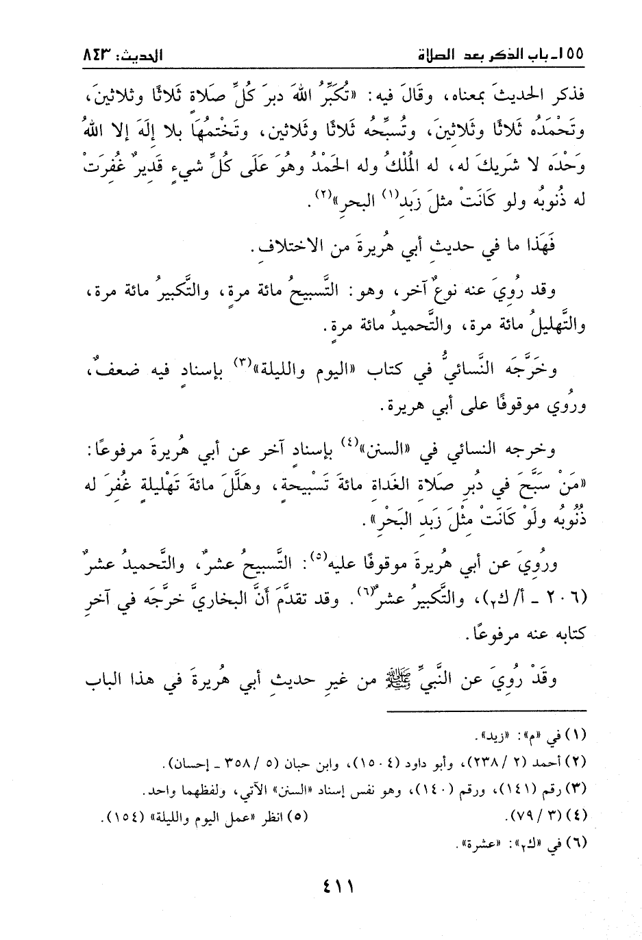 وخرّجه النسائي في ((السنن)) بإسنادٍ آخر عن أبي هريرة - مرفوعاً -: ((من سبح في دبر صلاة الغداة مائة تسبيحةٍ، وهلل مائة تهليلةٍ، غفر له ذنوبه، ولو كانت مثل زبد البحر)) .