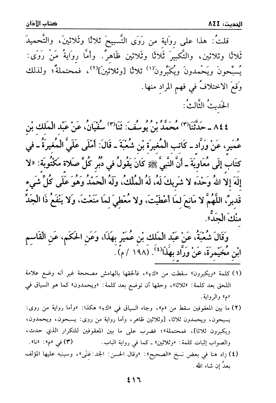 844 - حدثنا محمد بن يوسف: ثنا سفيان، عن عبد الملك بن عميرٍ، عن ورادٍ - كاتب المغيرة بن شعبة -، قالَ: أملى علي المغيرة في كتاب إلى معاوية، أن النبي - صَلَّى اللهُ عَلَيْهِ وَسَلَّمَ - كان يقول في دبر كل صلاة مكتوبةٍ: ((لا إله إلا الله، وحده لا شريك له، له الملك، وله الحمد، وهو على كل شيء قديرٌ، اللهم، لا مانع لما أعطيت، ولا معطي لما