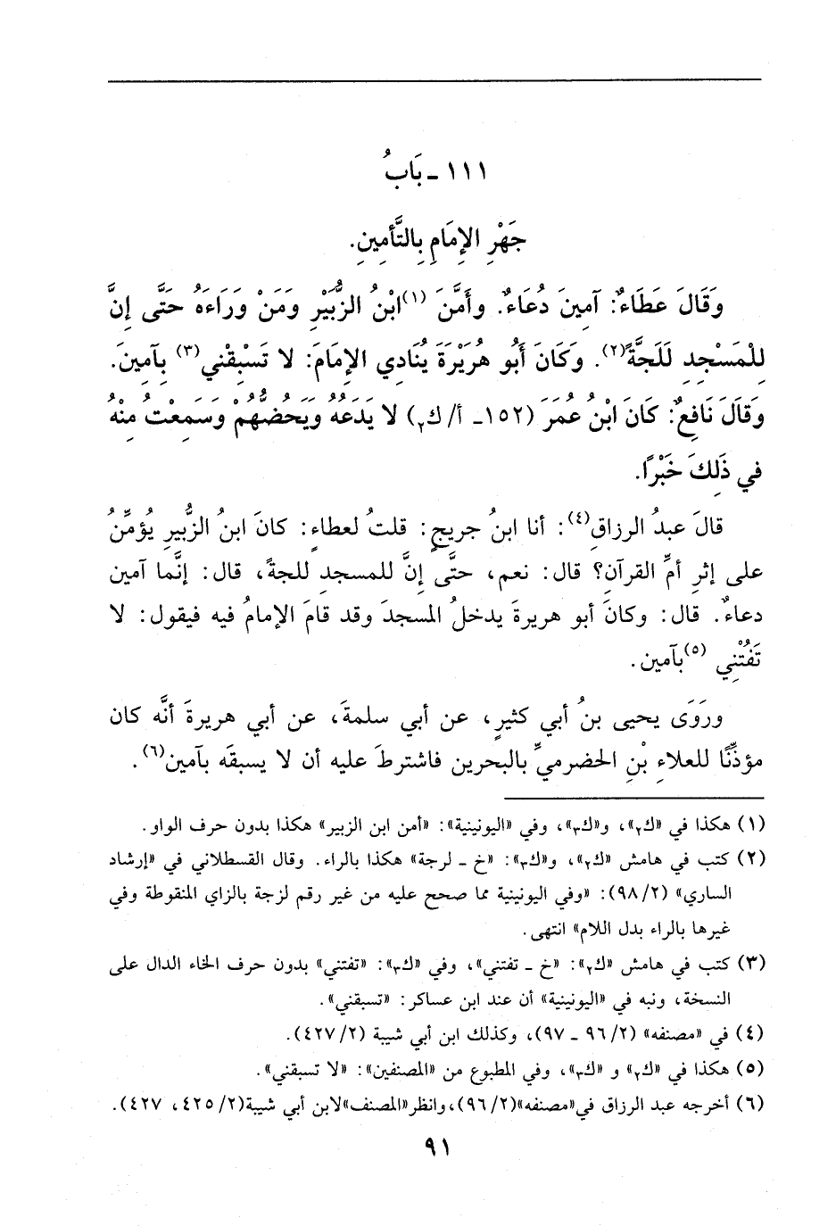 قال عبد الرزاق: أنا ابن جريج: قلت لعطاء: كان ابن الزبير يؤمن على إثر أم القرآن؟ قال: نعم، حتى إن للمسجد للجة. قال: إنما آمين دعاء قال: وكان أبو هريرة يدخل المسجد، وقد قام الإمام فيه، فيقول: لا تسبقني بآمين.