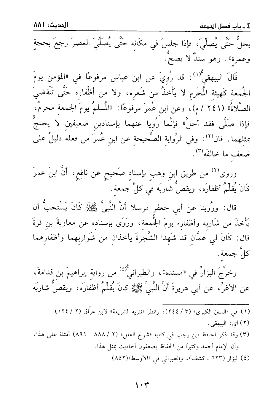 قال البيهقي: قد روي عن ابن عباسٍ – مرفوعاً – في ((المؤمن يوم الجمعة كهيئة المحرم، لا يأخذ من شعره ولا من أظفاره حتى تنقضى الصلاة)) ، وعن ابن عمر – مرفوعاً -: ((المسلم يوم الجمعة محرمٌ، فاذا صلى فقد أحل)) ، فانما رويا عنهما باسنادين ضعيفين، لا يحتج بمثلهما.