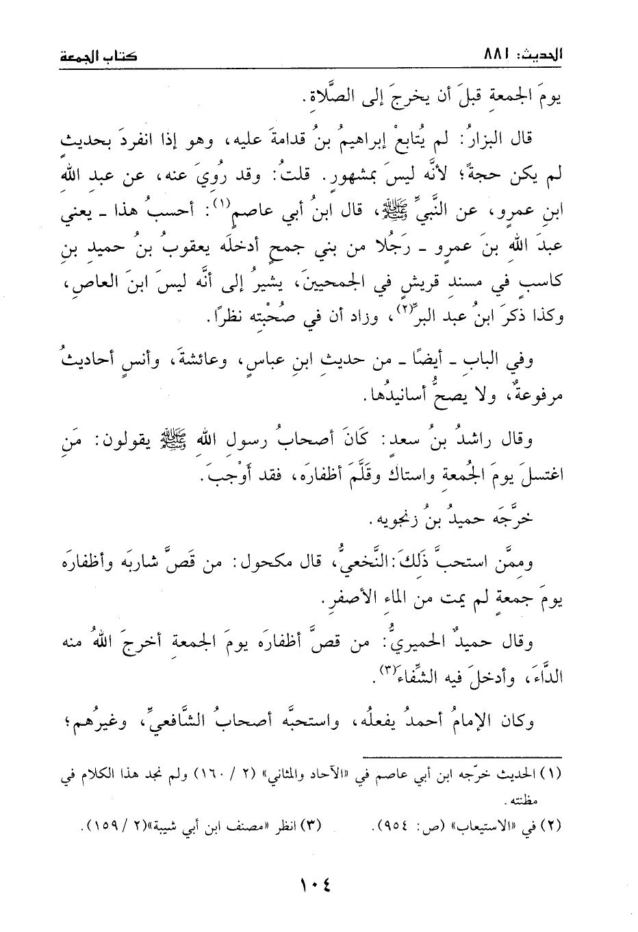 وقال راشد بن سعد: كان أصحاب رسول الله - صَلَّى اللهُ عَلَيْهِ وَسَلَّمَ - يقولون: من اغتسل يوم الجمعة واستاك وقلم أظفاره فقد اوجب.