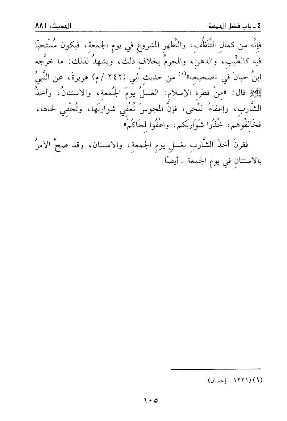 ويشهد لذلك: ما خرَّجه ابن حبان في ((صحيحه)) من حديث أبي هريرة، عن النبي - صَلَّى اللهُ عَلَيْهِ وَسَلَّمَ -، قال: ((من فطرة إلاسلام: الغسل يوم الجمعة، والاستنان، وأخذ الشارب، وإعفاء اللحى؛ فإن المجوس تحفى شواربها وتحفى لحاها، فخالفوهم، خذوا شواربكم وأعفوا لحاكم)) .