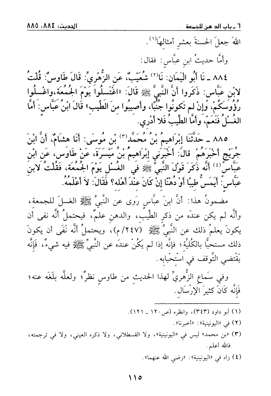 ثنا أبو اليمان: نا شعيب، عن الزهري: قال طاوسٌ: قلت لابن عباسٍ: ذكروا أن النبي - صَلَّى اللهُ عَلَيْهِ وَسَلَّمَ - قال: ((اغتسلوا يوم الجمعة، واغسلوا رءوسكم، وان لم تكونوا جنباً وأصيبوا من الطيب)) ؟ قال ابن عباسٍ: أما الغسل، فنعم، وأما الطيب، فلا أدري.