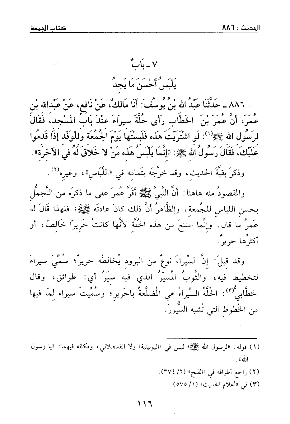 886 - حدثنا عبد الله بن يوسف: أنا مالكٌ عن نافعٍ عن عبد الله بن عمر أن عمر بن الخطاب رأى حلةً سيراء عند باب المسجد فقال يا رسول الله لو اشتريت هذه، فلبستها يوم الجمعة وللوفد إذا قدموا عليك فقال رسول الله - صَلَّى اللهُ عَلَيْهِ وَسَلَّمَ - ((إنما يلبس هذه من لا خلاق له في الآخره)) - وذكر بقيه حديث.