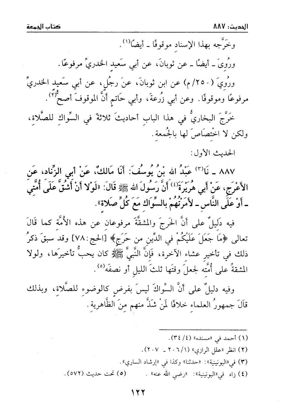 ثنا عبد الله بن يوسف: أنا مالكٌ، عن أبي الزناد، عن الأعرج، عن أبي هريرة، أن رسول الله - صَلَّى اللهُ عَلَيْهِ وَسَلَّمَ - قال: ((لولا أن أشق على أمتي –أو على الناس – لأمرتهم بالسواك مع كل صلاةٍ)) .