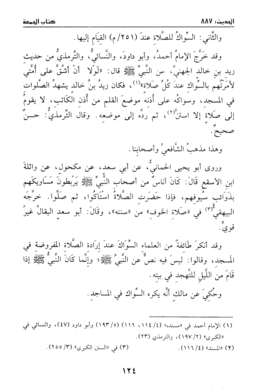 وروى أبو يحيى الحماني، عن أبي سعدٍ، عن مكحولٍ، عن واثلة بن الأسقع، قال: كان أناسٌ من أصحاب النبي - صَلَّى اللهُ عَلَيْهِ وَسَلَّمَ - يربطون مساويكهم بذوائب سيوفهم، فاذا حضرت الصلاة استاكوا، ثم صلوا.