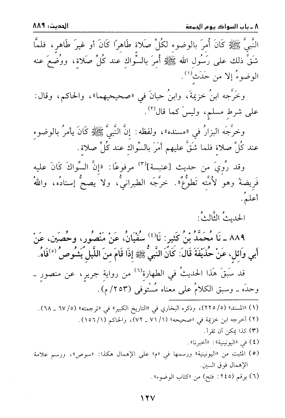 نا محمد بن كثير: نا سفيان، عن منصور وحصين، عن أبي وائلٍ، عن حذيفة، قال: كان النبي - صَلَّى اللهُ عَلَيْهِ وَسَلَّمَ - إذا قام من الليل يشوص فاه.